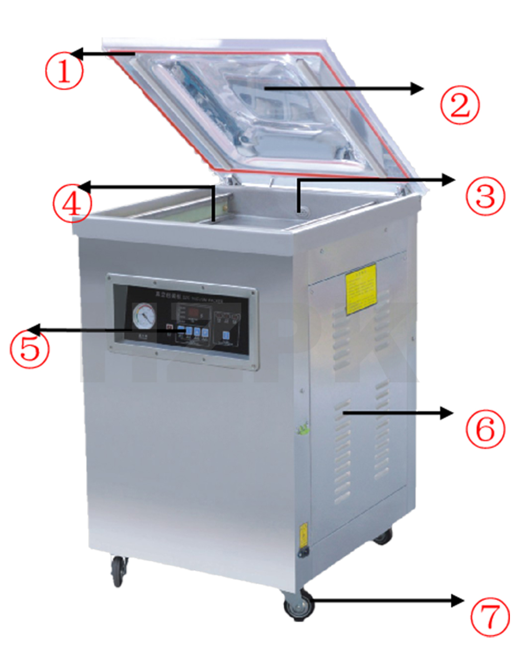 ①——Sealing rubber ②——Chamber cover ③——Pumping holes ④——Vacuum chamber ⑤——Control panel ⑥——Cooling hole ⑦——Wheel