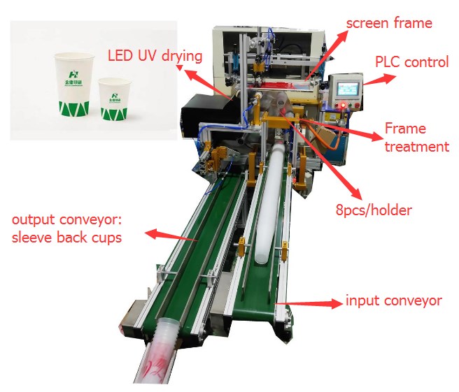 Fully automatic screen printer is a high speed LED UV round screen printer with auto feeding and auto unloading for printing logos on disposable plastic cup, PP cup, PET cup, paper cup, U type cups...