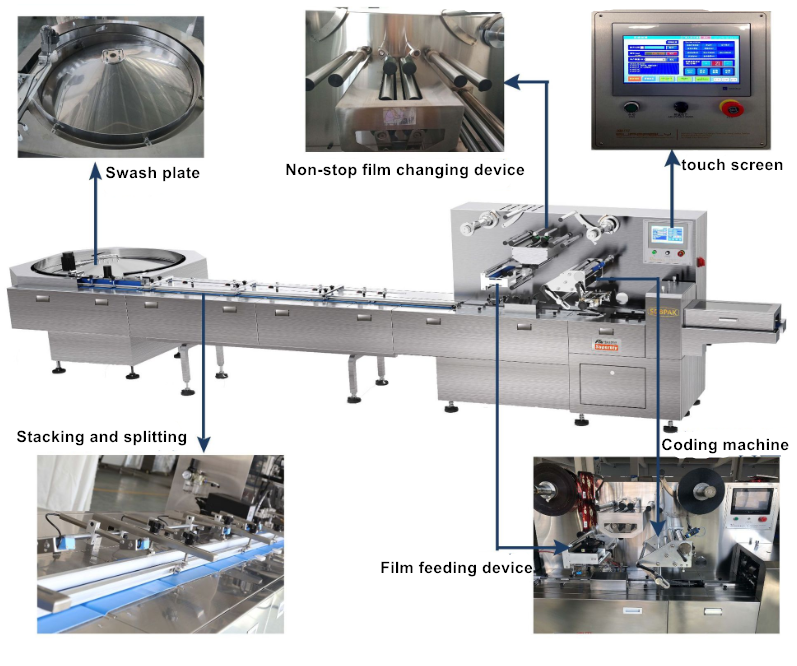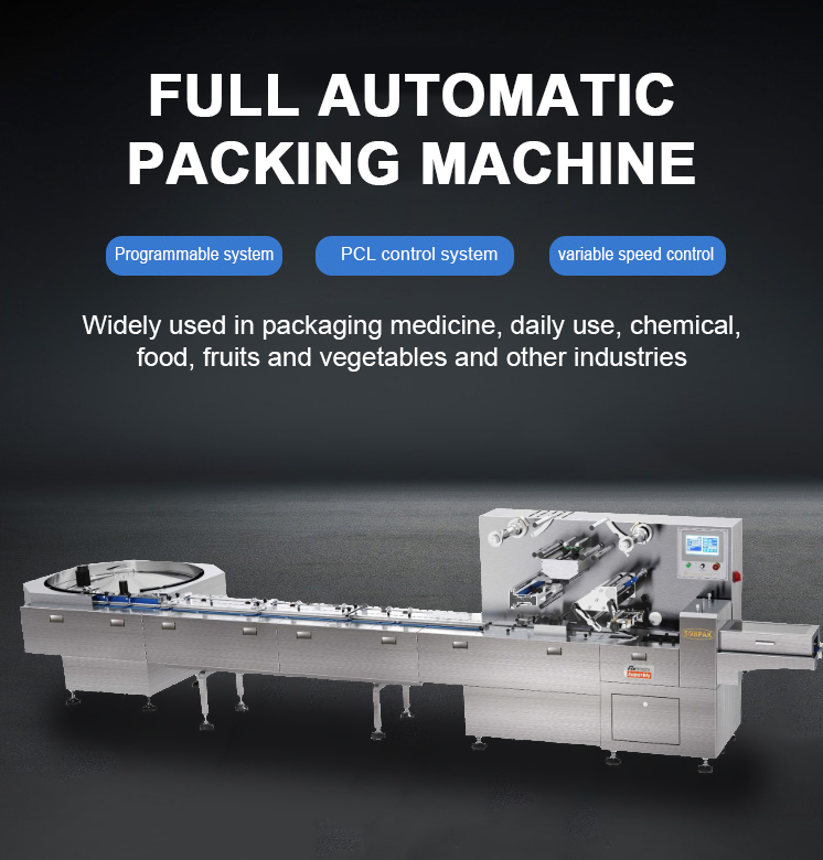 This flow packing machine is suitable for packing products as single piece or more pieces of candies in one bag.