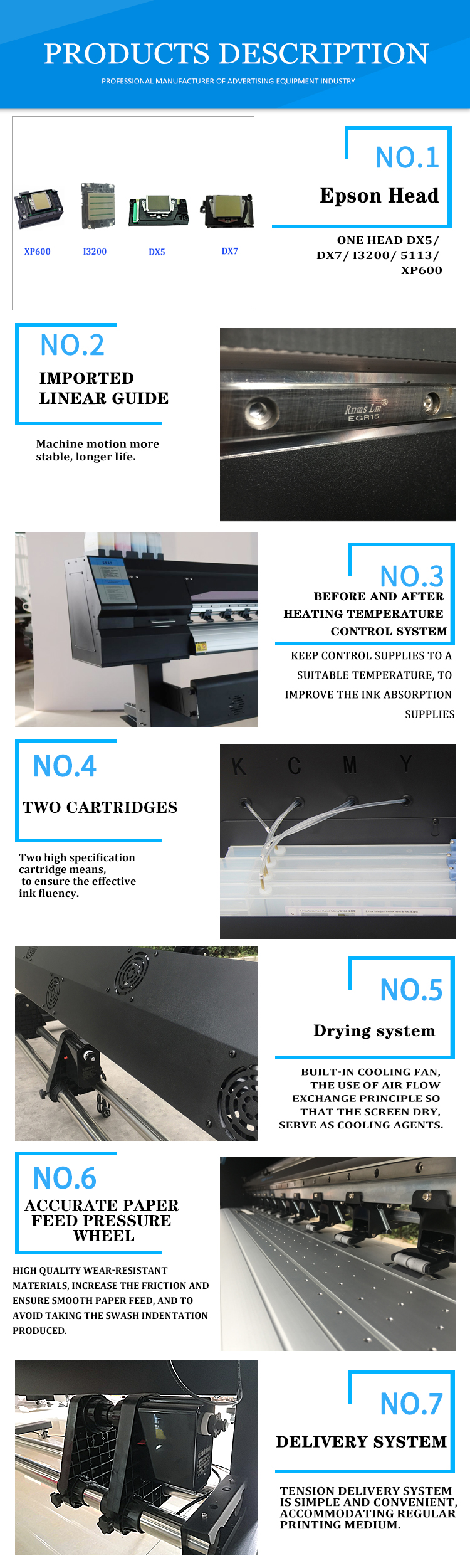 Eco Solvent Printer is suitable for producing advertising and transferring printing in almost of material. It is widely used to eco solvent printing , like vinyl,flex banner, canvas, photo paper, PP paper, light film, Car sticker, Wallpaper, Tarpaulin.