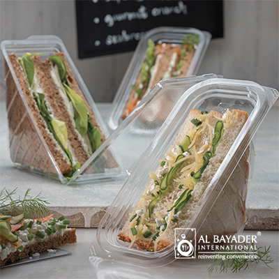 Al Bayader cRUSTIPAC Sandwich-Wedge Packs includes two popular sizes of shelf-life enhancing wedges with hinge or separate lid. May it be tuna, chicken, egg, cheese, or veggie sandwiches, this range can cater to them all.