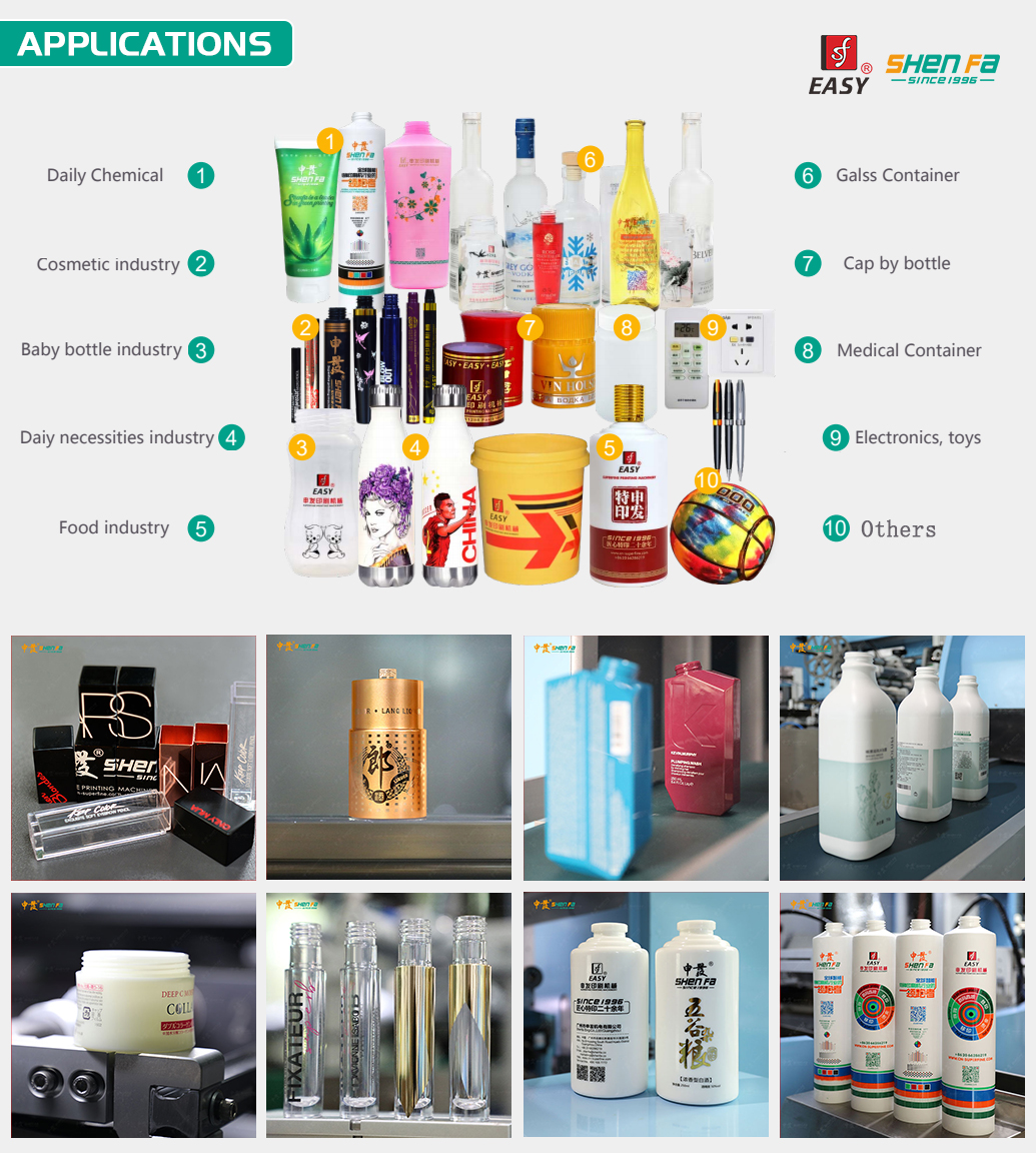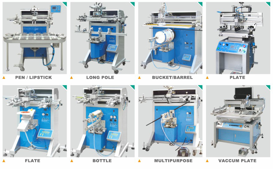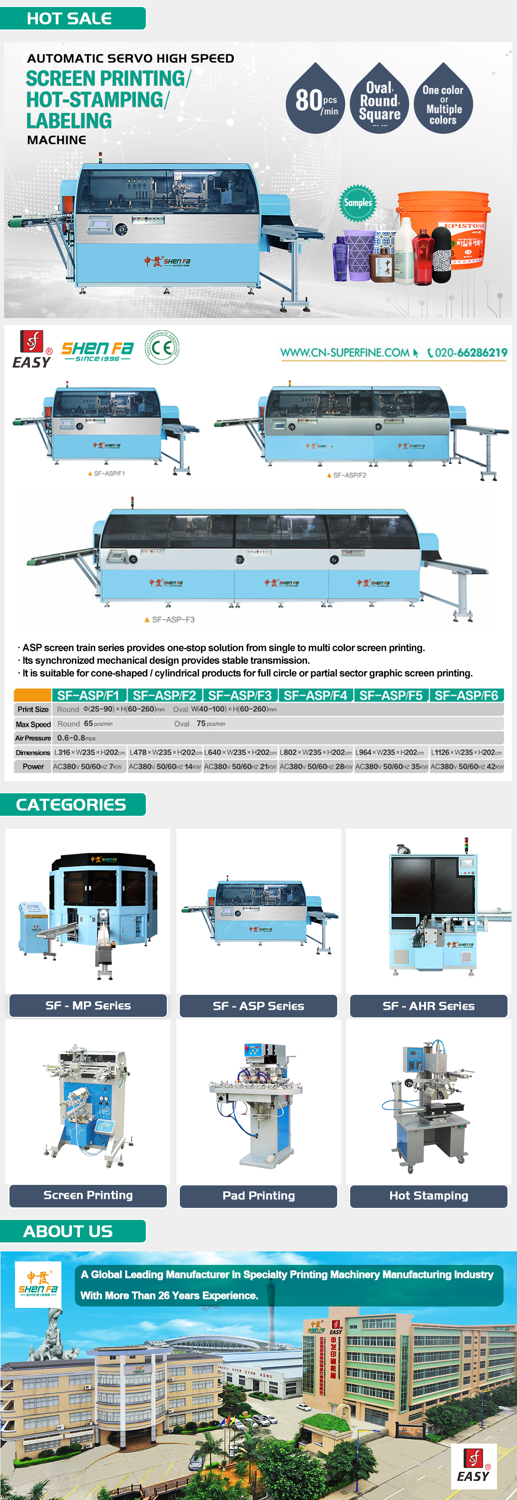 Screen Printer SF-250/A is suitable for precise printing substrates in Cylindrical, Conical, Oval forms with smooth curve surface and made of various materials such as Glass, Plastic, metal, Ceramic, Wood, etc. Printing objects such as cosmetic bottles, scour bottles, drink bottles, paper cups, plastic cups, glass bottles, metal cups, wristbands, lipstick, pots, oil-filter shells, etc.