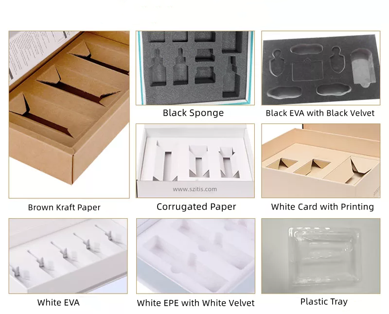 Boxes Accessory | VAC tray, Ribbon, PVC or PET tray, EVA, Sponge, Velvet, Cardboard or Flocking inserts. |