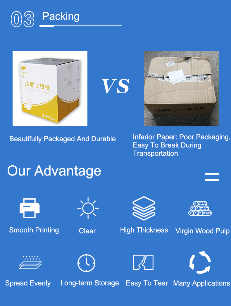 Product Application:We are factory of manufacturing in thermal paper roll with competitive price in the world market , Our thermal paper roll are wildly used in Supermarket、Chain stores 、Restaurant、 Shopping mall 、 Pos machine、 Hospitality 、Retail store、 Gas station、 Credit card processing、Slot machine 、 Medical industries 、Bank 、ATM and Office building.etc