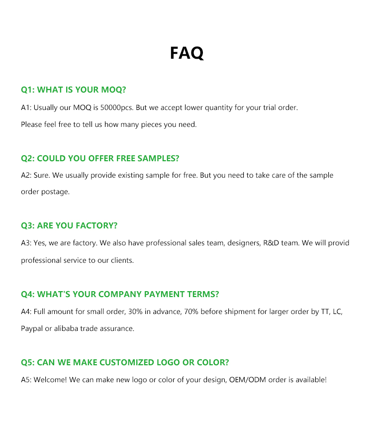packaging | 50pcs/bag, 4 bags/ctn or your own custom packing | |||