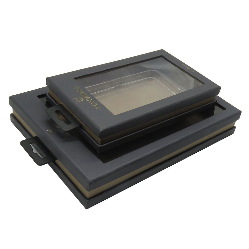 custom phone case box packaging with a clear pvc window and plastic tray soft touch film
