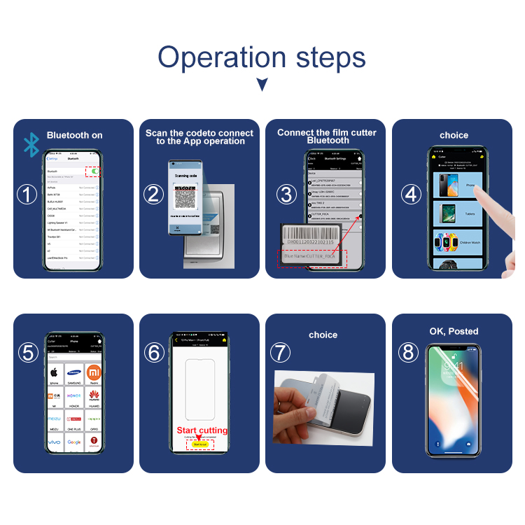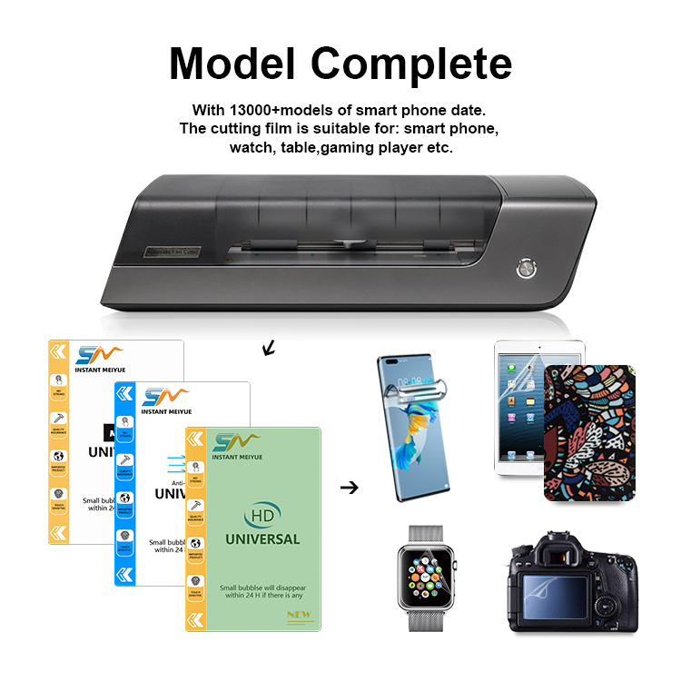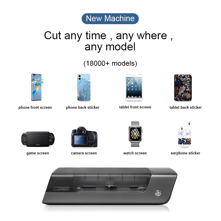 A compact and lightweight film cutting machine, which automatically cuts various PET and TPU flexible films, covering 18000+ mobile phone models, including lens/mobile phone front film and rear film, tablet computers, cameras, game consoles, smart watches, etc. The membrane is universally digital and is continuously updated. The machine supports multiple languages, built-in WIFI and Blue-tooth, with app, automatic film cutting, can learn to operate in 2 minutes, no inventory, low investment, fast profit! A marketing tool designed for terminal stores and entrepreneurs.