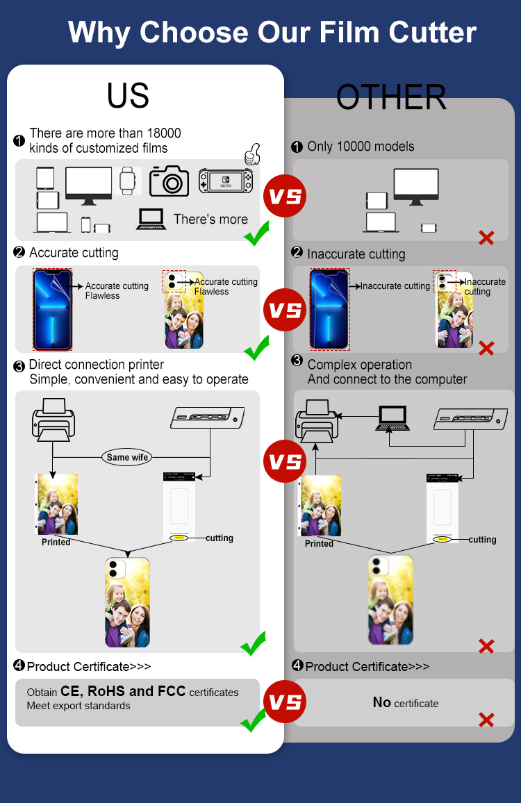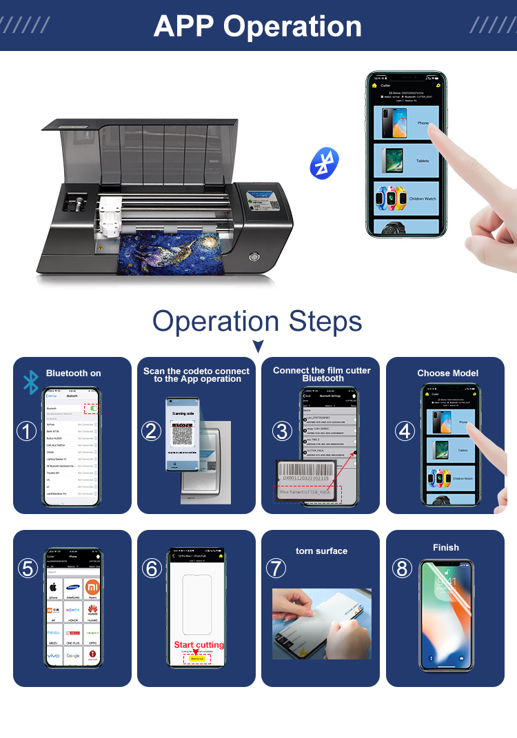holder and the knife head, and then put the materials; connect WiFi to the Screen Protector Cutting Machine; select the cut mobile phone model, click "Cut" button; start automatic cutting, and automatically exit the material after completion.