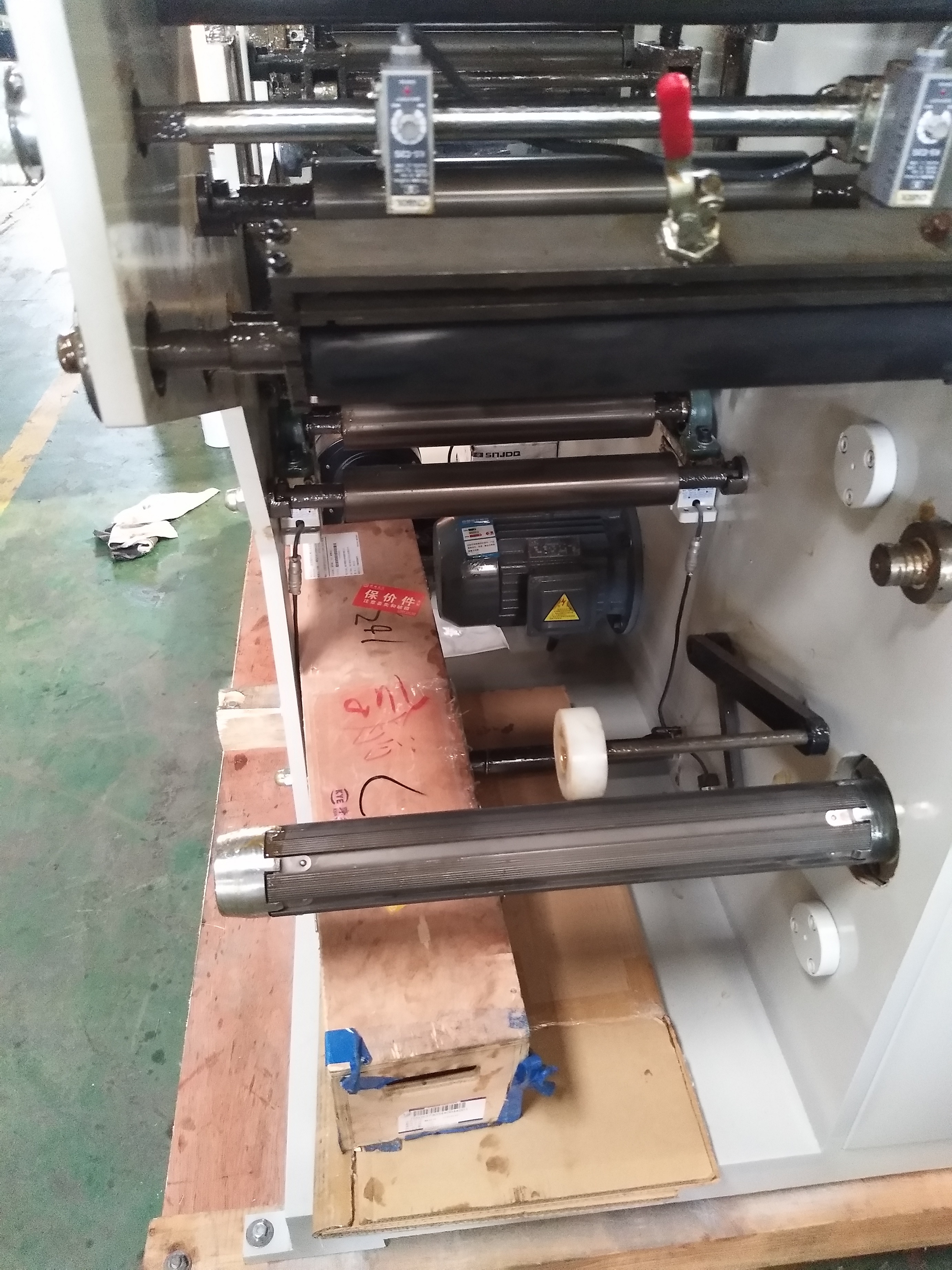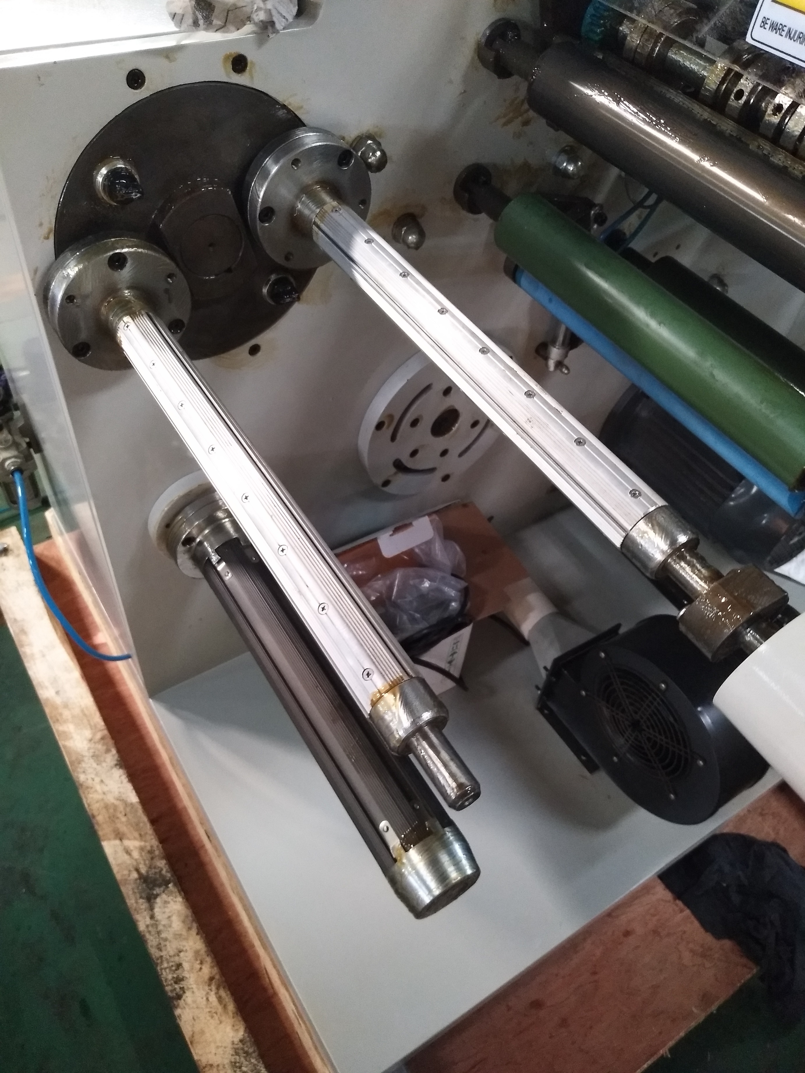 g) The machine has both 2pcs 1.5 inches air shaft for rewind small reels, and also 1pc 3 inch air shaft for rewind big rolls. All the shafts are exchangeable.