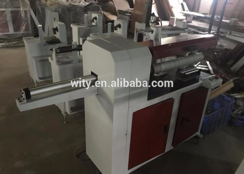 Load the paper core--->power on and press the start button--->motor will rotate cylinder--->drive the anvil roller shaft--->blade move down--->cut the paper core--->blade move up--->cylinder push the paper core out pusher go back after touching the limit switch--->ready for next cutting.