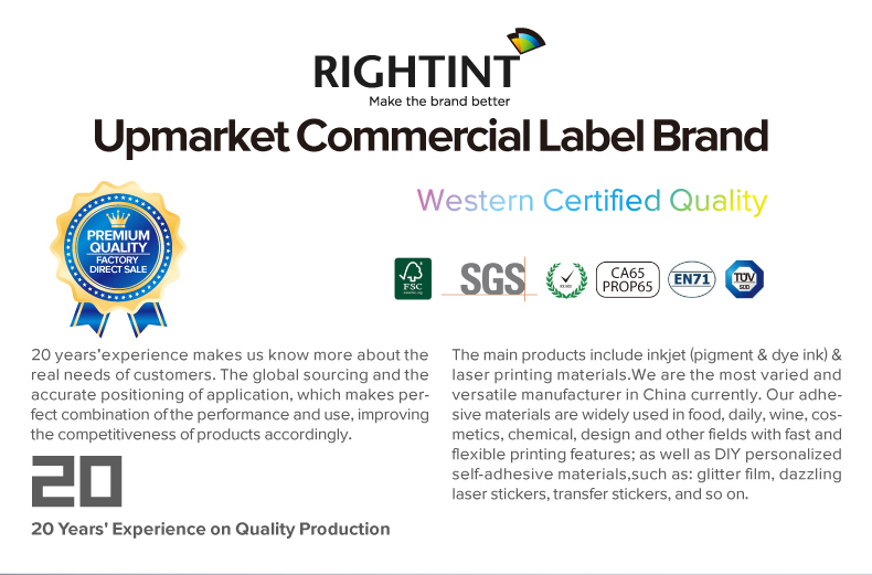 Shanghai RIGHTINT New material technology Co., Ltd. is committed to research and development,promotion and application of self adhesive materials.Our main products are DIY personalized decoration products,such as glitter film, deco sticker,Inkjet & Memjet materials,which are suitable for waterbased ink printer;the world famous wine labels and luxury labels, etc. More than 20 years' experience makes us know more about the real needs of customers.The global sourcing and the accurate positioning of application,which makes perfect combination of the performance and use,improving the competitiveness of products accordingly.