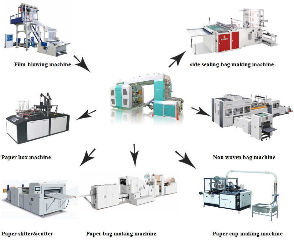 This machine is suitable for printing such packing materials as PE, PP bag, cellophane and roll paper, etc. It is a kind of ideal printing equipment for producing paper packing bag for food, supermarket handbag, vest bag and clothes bag, etc.