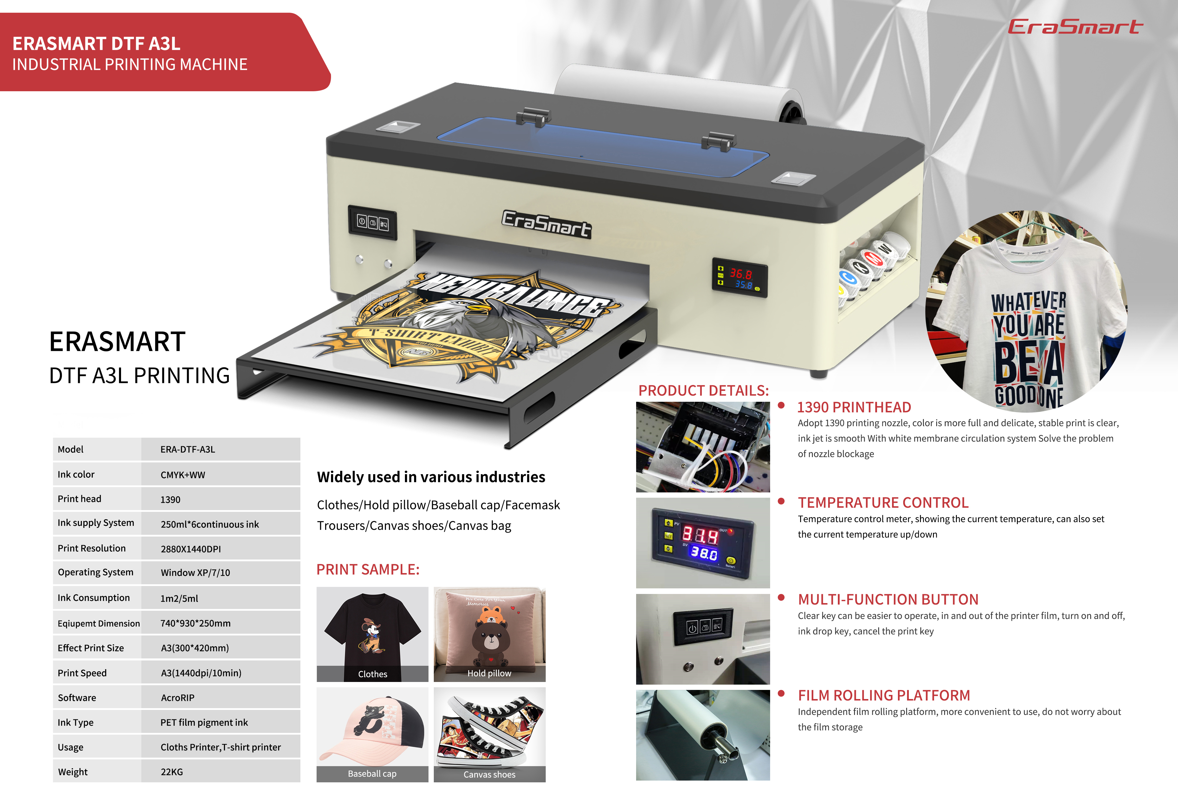 Erasmart Newest A3 DX5 1390 L1800 head DTF Digital Inkjet T-Shirt Heat Transfer Pet Film Printer