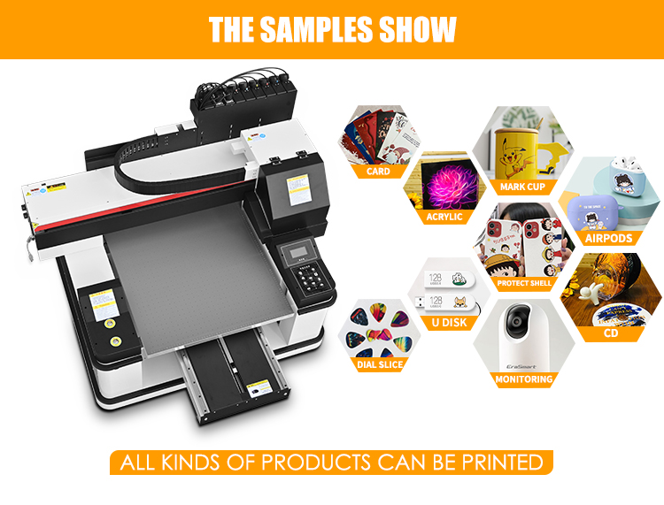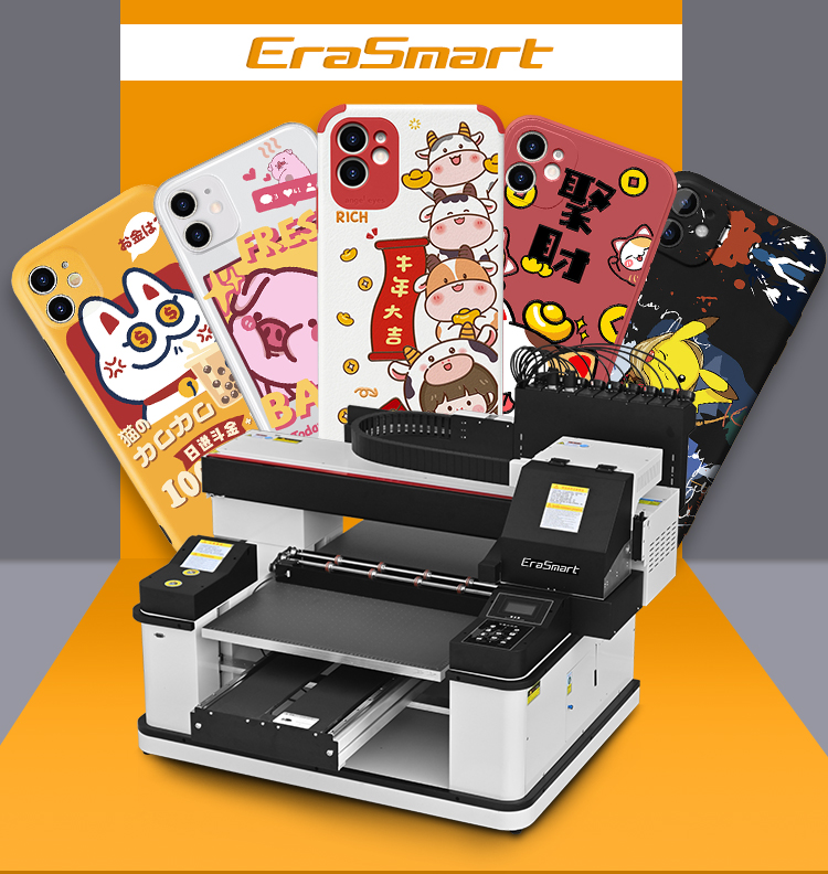 UV flat-panel printer, also known as universal flat-panel printer or UV inkjet flatbed printer, breaks through the bottleneck of digital printing technology and reach the level of staring with single page without plate-making and full-color image printing at one time in the true sense. Compared with traditional printing technology, it has many advantages. EraSmart UV flatbed printer adopts stable platform technology and advanced stepper motor drive mode. It combines infrared meanwhile, laser positioning, water-cooling and air-cooling to meet long-term continuous work requirement. It has a wide print range and can print products within 170mm height. EraSmart UV inkjet printer can be printed with almost unlimited material. For example mobile phone case, stone cameo, acrylic board, wallet, customized steel film, wallpaper, ceramic tile, U disk, CD-ROM, glass, ABS, PVC etc.