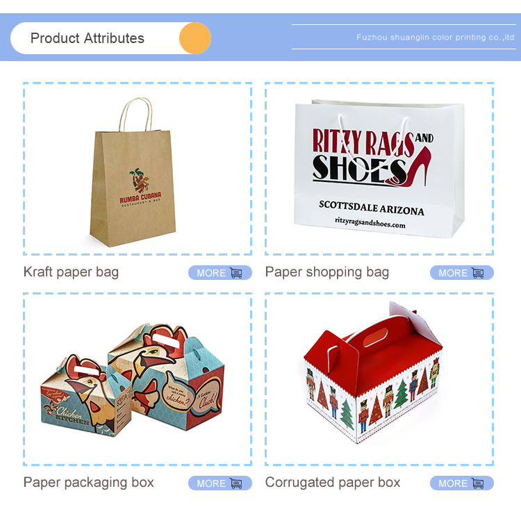 | Size/shape:customized made Structure:self folding bag The material1.brown kraft paperbag(100g,120g,150g,180g,200g,250g)2.white kraft paper bag(100g,120g,150g,180g,200g,250g)3.art paper(128g,157g,180g,200g,230g,250g,300g,350g)4. ivory paper card(190g,210g,230g,250g,300g,350g,400g)5.white board paper(230g,250g,300g,350g,400g)6.corrugated paper type :E B F flute,BC Flute7:Other specialty paperColor:CMYK as well Pantone Printing:off-set printing,flexo Handle:nylon rope,ribbon,cotton rope,PP rope,flat paper handle,twisted paper handle.die cutFinishing:matte/glossy lamination,glossy/matte varnish,UV coating,die cutting,embossing,debossing,gold/silver hot stamping ect.Sample time:5-7 days,leadtime 15-20days for mass order,it depends on the quantity.Package:25pcs per opp bag,100-200pcs per carton |