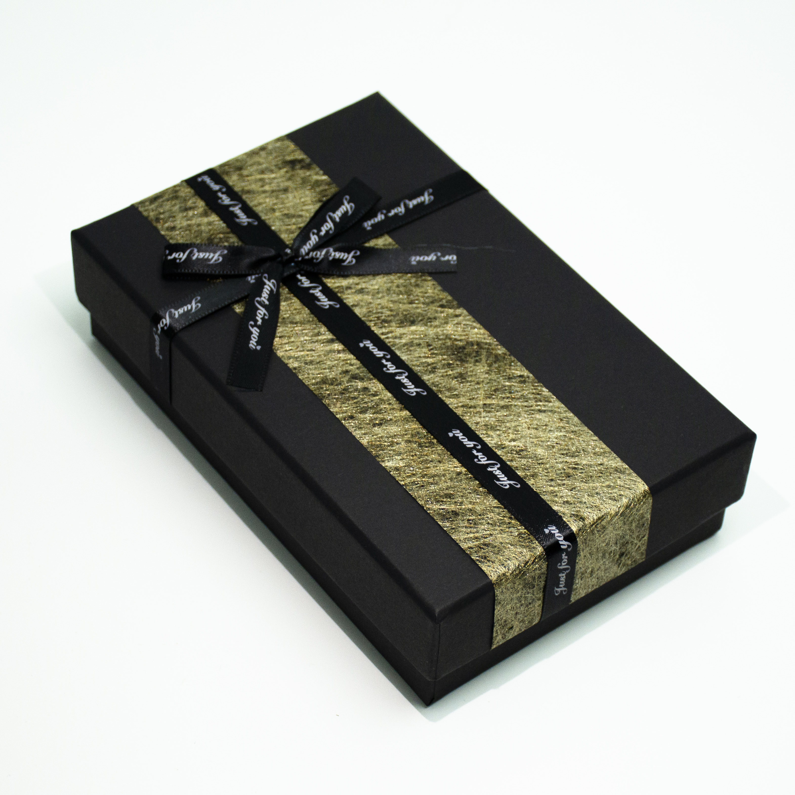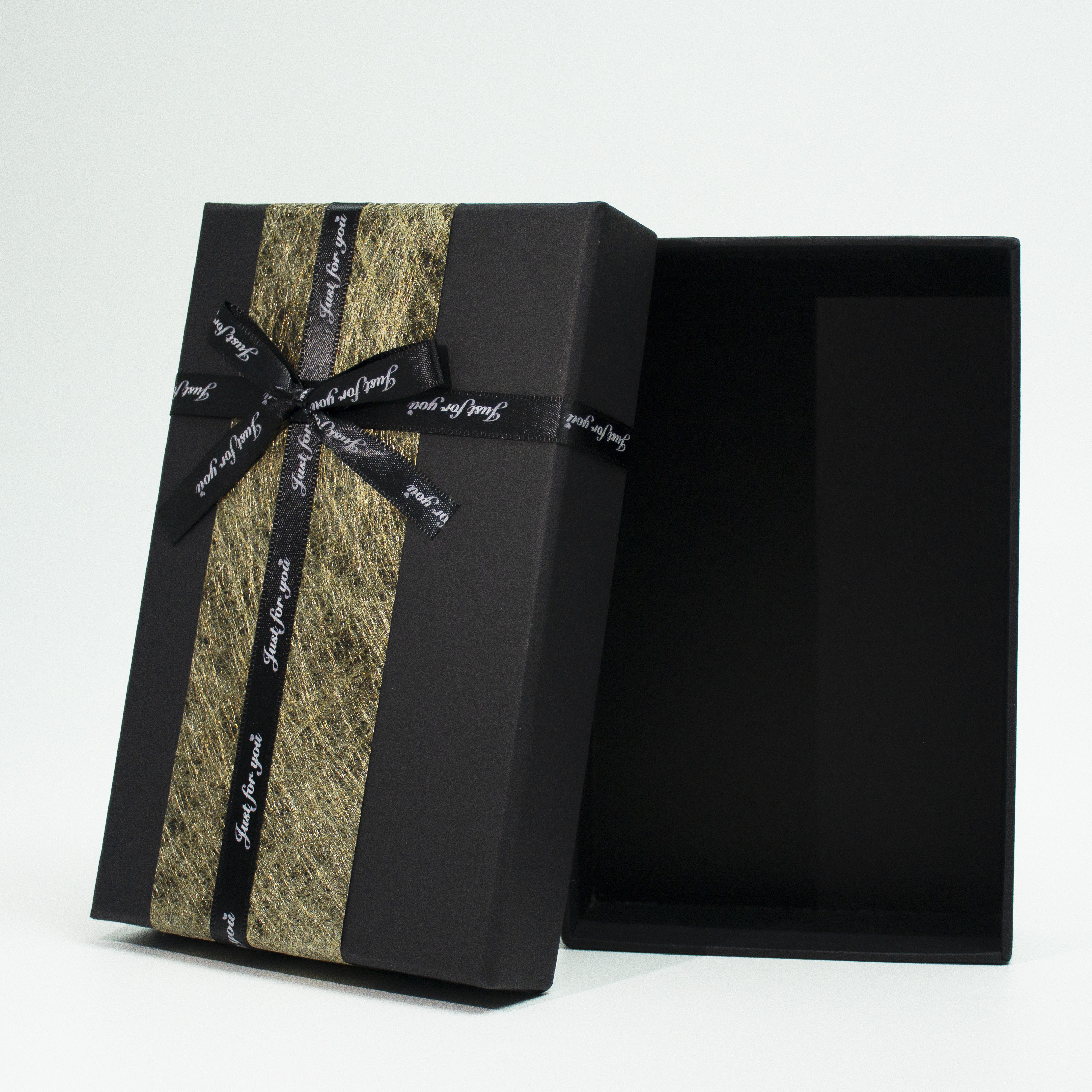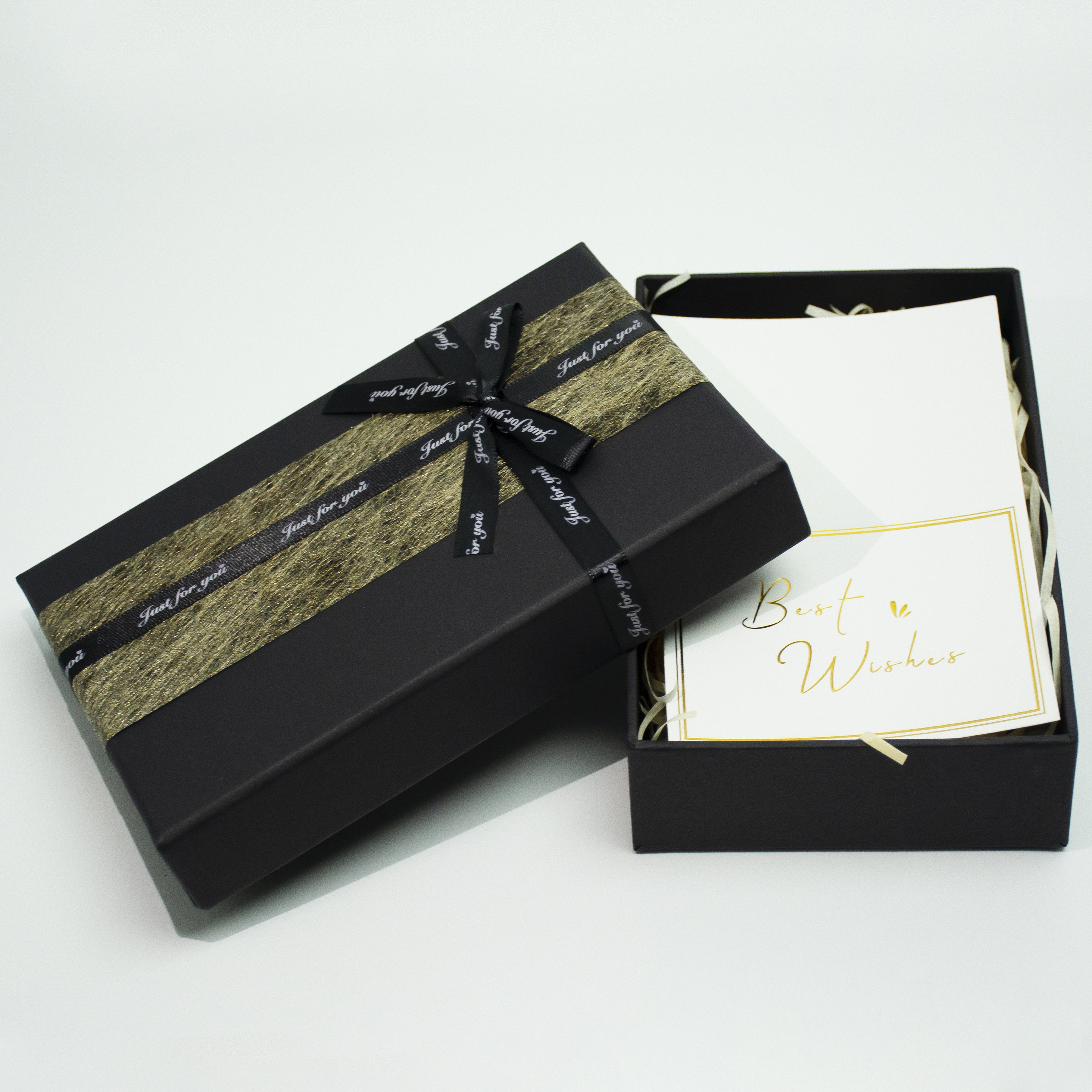 Custom printing rigid cardboard packaging paper Box black gift box with golden lettering ribbon for