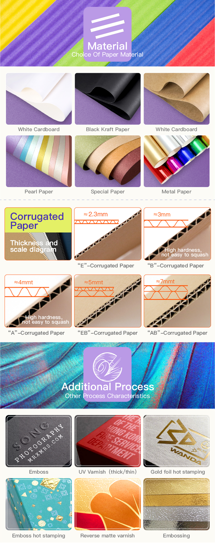 Material Option: | Outer liner: white cardboard, coated paper, art paper,duplex paper,fancy paper,recycled paper etc.Inner liner: corrugated paper, kraft paper, special paper etc.Wide Range for Your Selection. |