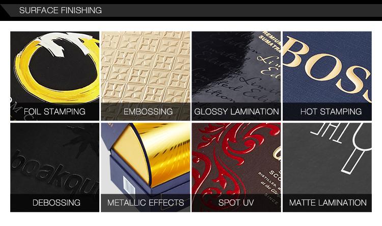 Options: Glossy/ Matte Lamination, Vanishing, Aqueous Coating, Flocking, Gold / Silver hot stamping (foil), Debossed/ Embossing,Texture, Spot UV as Following Pictures and Videos.