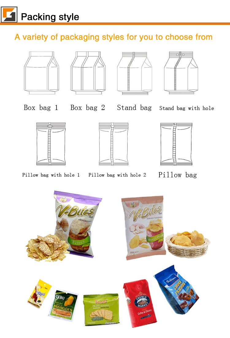 Suitable for packaging many different kinds of products; such as puffy food, shrimp roll, peanut, popcorn, cornmeal, dried fruit, seed, small hardware,dumplings, vegetable, fruits and sugar etc.which shape is roll, slice and granule.