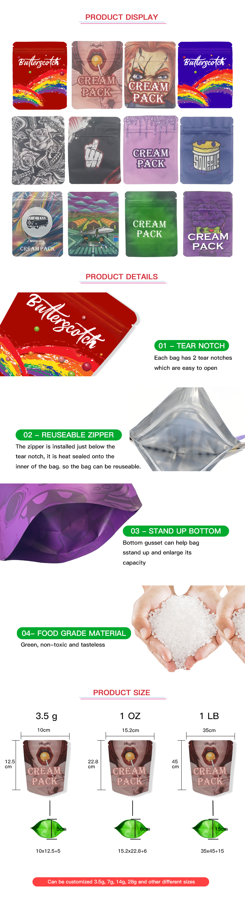 Custom 3.5g Printed New Baggies Aluminized Foil Smell Proof cookie Plastic Packaging Mylar ZipLock Bags