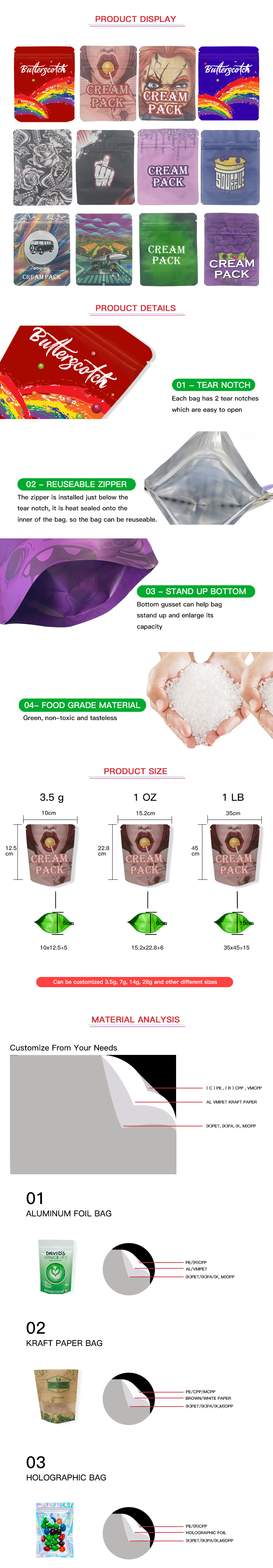 Custom 3.5g 7g 14g print resealable plastic food seal packaging ziplock foil pouch zipper smell proof cookie mylar bag with logo