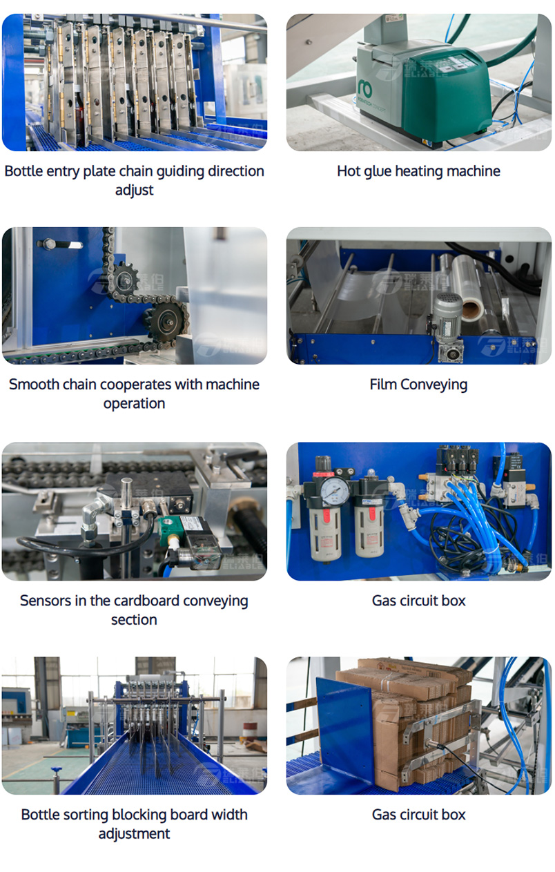 1. Bottle hander film wrapping: via bottle handing pole control each group bottle movement distance, let it synchronization with film lifting pole, and let bottle push to film wrapping section belt; film lifting pole and film lifting device match torsion limit stopper, while bottle drop or bottle block, limit stopper movement let machine auto stop, after failure solve, then turn limit stopper hand wheel reset.