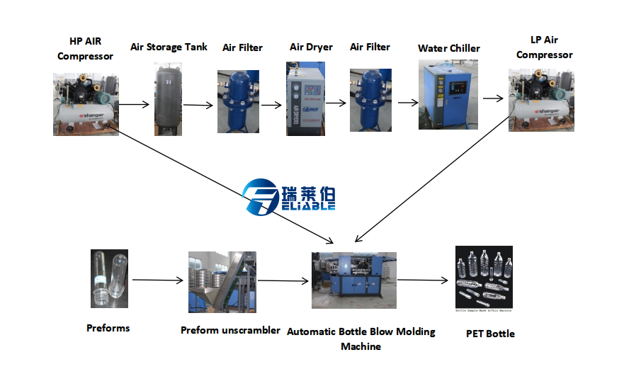 Preform→Preform storing parts→Preform heating(temperature adjustment) →(Pull stretch→Blow air→ Release Air→ Blow pin and mouth at same time→Close the blow mouth→Forming)→Finished