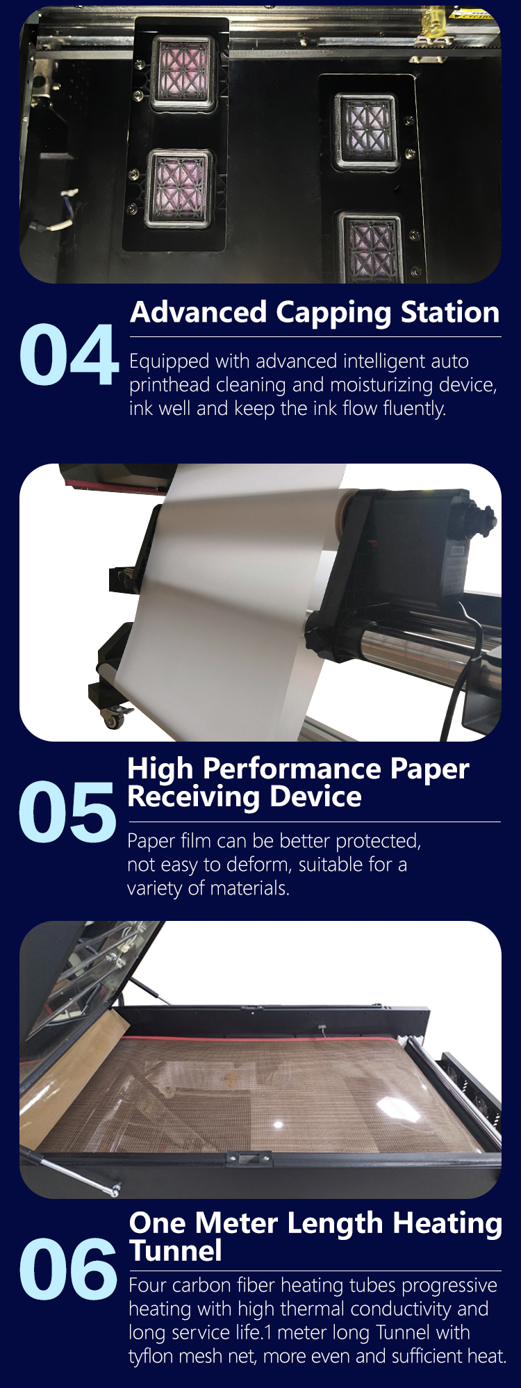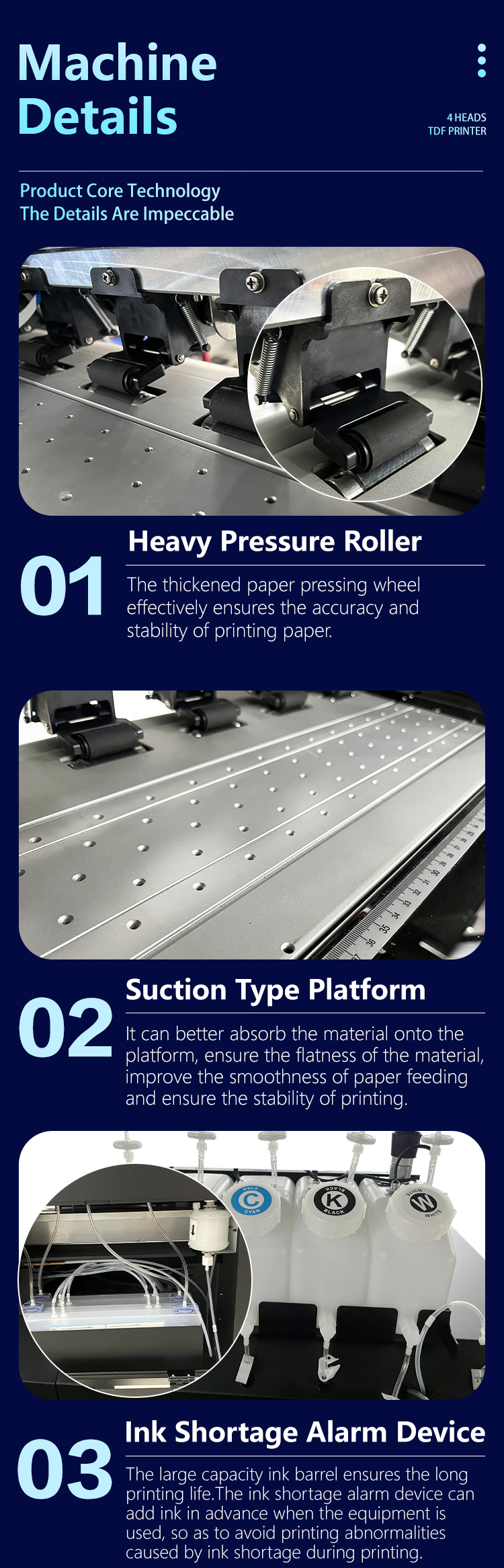 4 Heads DTF Printer: Nozzle:4*800(i3200/4720); 6*180(XP600); Resolution: 3200dpi(i3200/4720); 1080dpi(XP600);Speed is 2 times than 2 heads DTF Printer; Shaker Powder Machine: Built-in Purifier