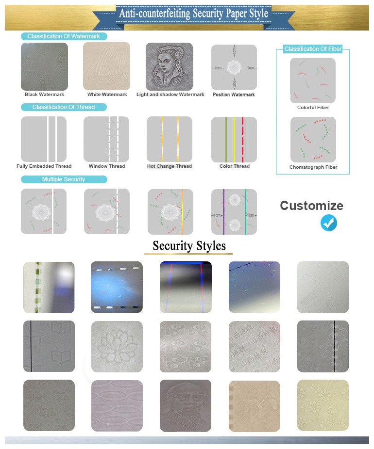 Application | It is mainly used in the government offices, certificates, lottery, bills , real estate contract, education department, famous brand food and clothing, medicine, cosmetics, tobacco, tea, wine, publishing industry, and so on. The security features with high-anti-counterfeiting, safety and strong confidentiality. Even advanced technology and reliable equipment can not copy it. | ||