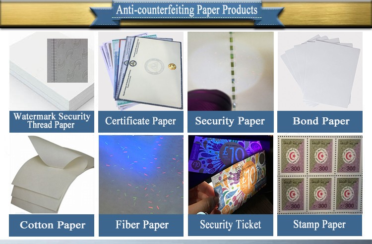 Security thread paper Technical features | Security thread paper is manufactured by putting a metal wire or plastic wire in the paper during the papermaking process .It can be divided into fully embedded security thread paper and window thread paper according to the manner of burying the safety siding. We also can add information on the thread such as the company name or product name and the color of the thread is different according to clients’ requirement. | ||