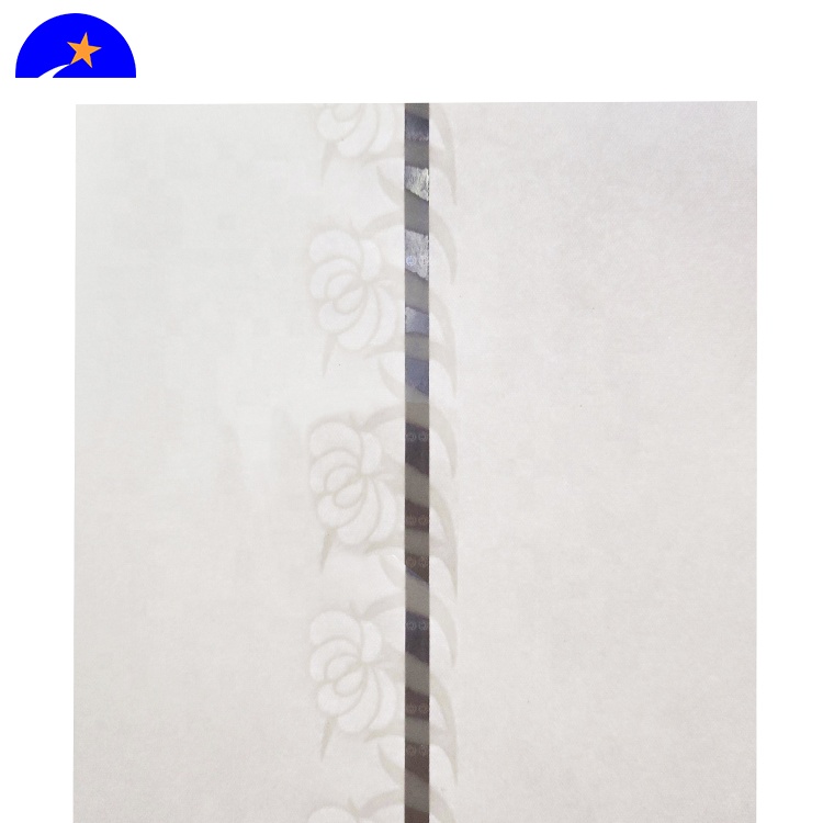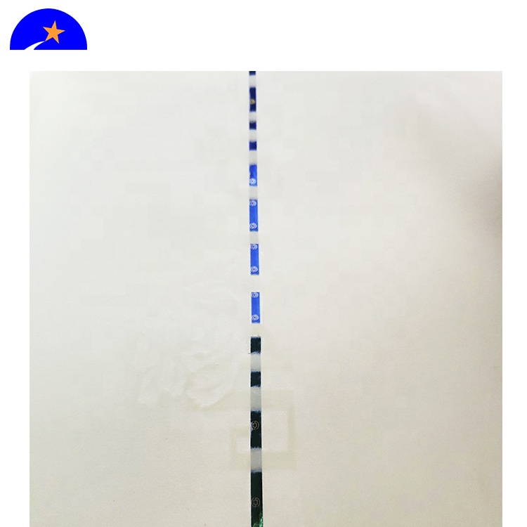 Security thread paper Technical features | Security thread paper is manufactured by putting a metal wire or plastic wire in the paper during the papermaking process .It can be divided into fully embedded security thread paper and window thread paper according to the manner of burying the safety siding. We also can add information on the thread such as the company name or product name and the color of the thread is different according to clients’ requirement. | ||